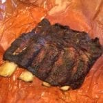 After three hours in the WSM, wrap the ribs in a layer of pink butcher paper. Return them to the cooker or move them into a 275°F oven and continue cooking until tender. Start testing for tenderness at the 4 hour mark; ribs should be done after 4-5 hours of total cooking time.