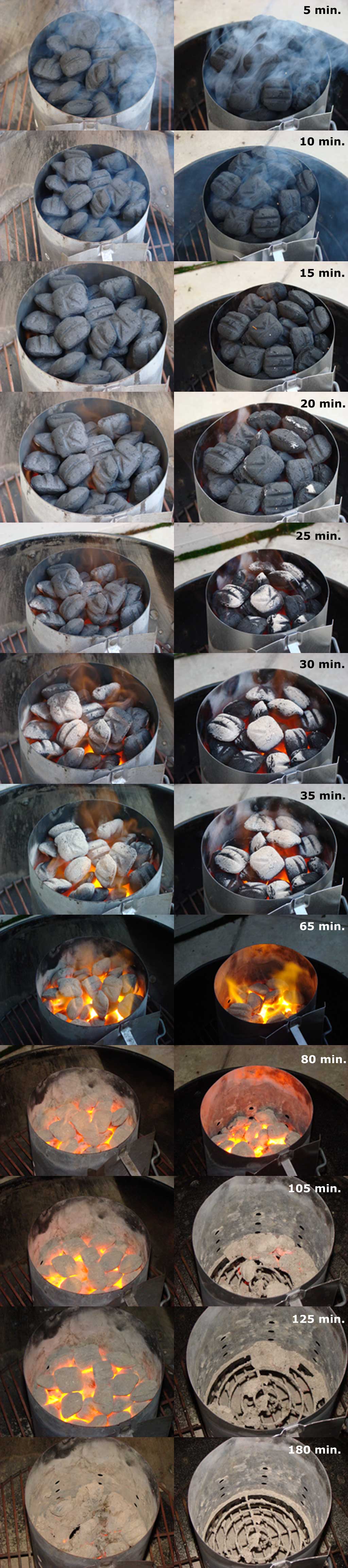 Notice that the first visible orange color of lit charcoal deep inside the chimneys can be seen at 15 minutes with both charcoals, but the Competition Briquet is also giving off a few little orange sparks, too.