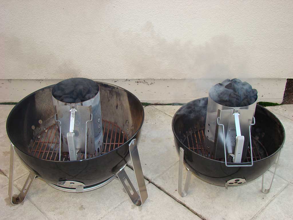 Two Weber chimney starters of “blue bag” Kingsford (left) and new Competition Briquets (right). Note that the 100 Competition Briquets mounded up over the top of the chimney starter.