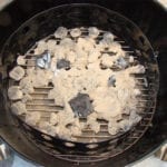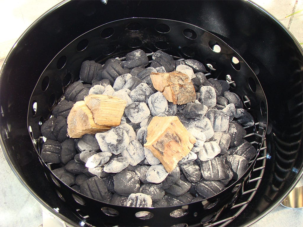 I fired the 22.5″ WSM using the Minion Method and a 21.6-pound bag of Kingsford Charcoal Briquets. I used a Weber chimney starter to light 50 briquettes and spread them over the unlit charcoal, added 4 chunks of apple wood, and put 2 gallons of water into the pan.