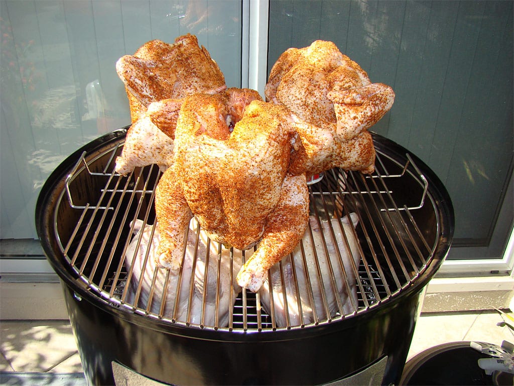 Three chickens went onto both the top and bottom cooking grates. The cooker immediately jumped past 250°F, and even with all the bottom vents fully closed, the cooker ran in the 260-270°F range for 90 minutes before drifting down to 245-250°F and stayed there 2-1/2 hours until these chickens were done. I never did open the bottom vents.