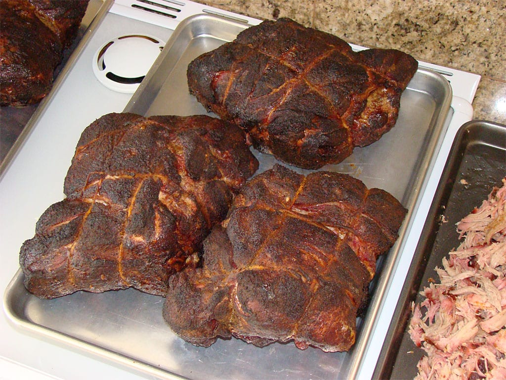 My fourth test cook was another 45 pounds of pork butt. I wanted to see if I could get more than 11 hours out of a big bag of Kingsford. This time I used 2 gallons of hot water in the pan instead of cool water. It was a calm, warm night and never went below 63°F outside.