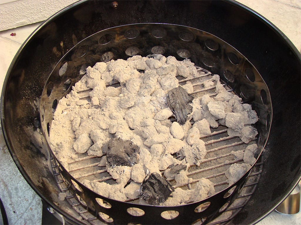 I fired the 22.5″ WSM using 7 pounds of Duraflame lump charcoal. I spread a hot Weber chimney starter full of lump over the unlit lump, added 3 chunks of cherry wood, and put 2 gallons of water into the pan.