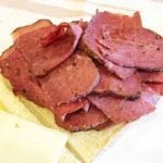 Another approach is to steam the pastrami the next day. This is the practice of many old-school delicatessens…smoke the pastrami as described above to an internal temperature of 150-170°F, refrigerate overnight, then place pastrami on a steam basket in a Dutch oven and steam for a couple of hours until it reaches an internal temp of 200-205°F. Let cool briefly before slicing across the grain.